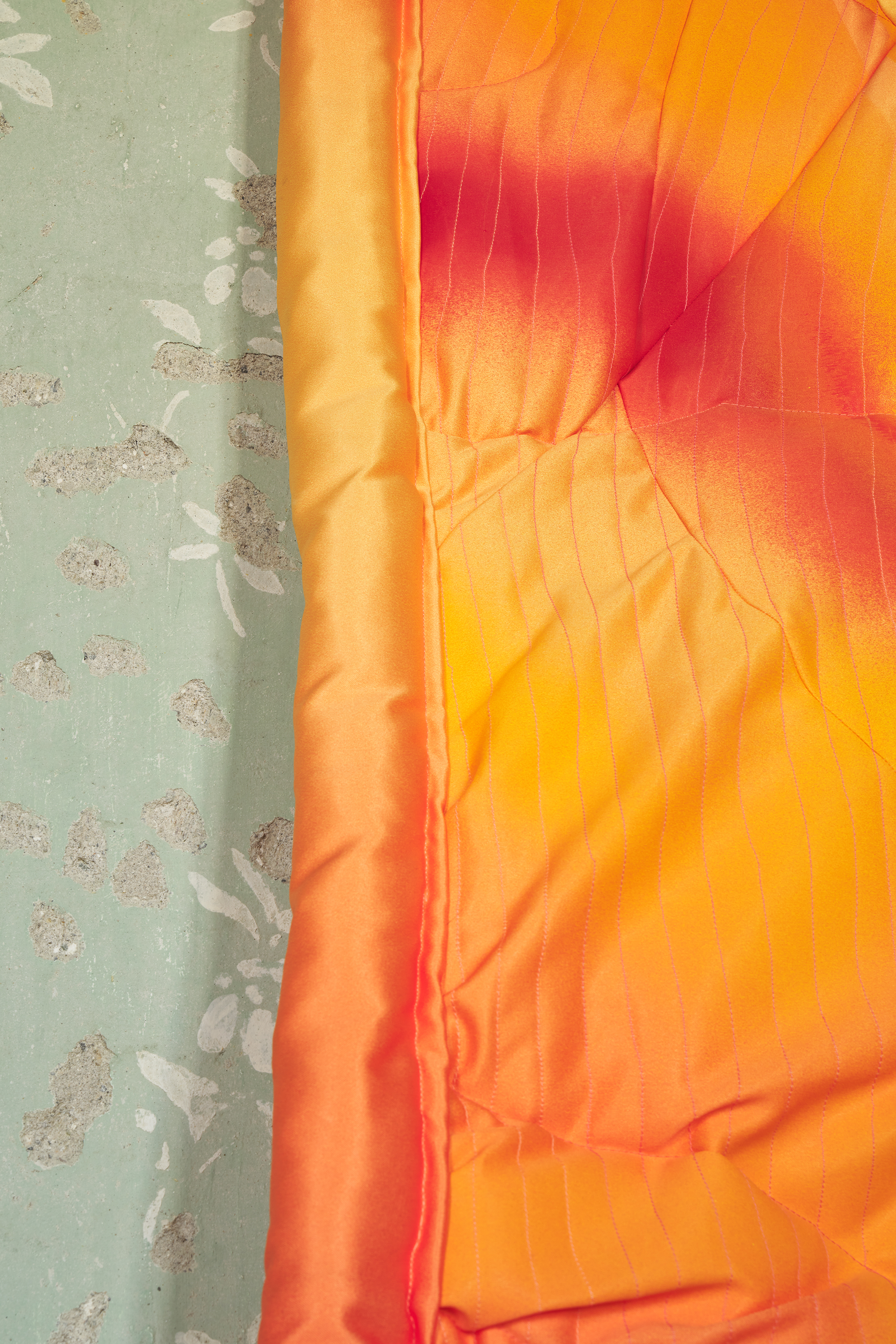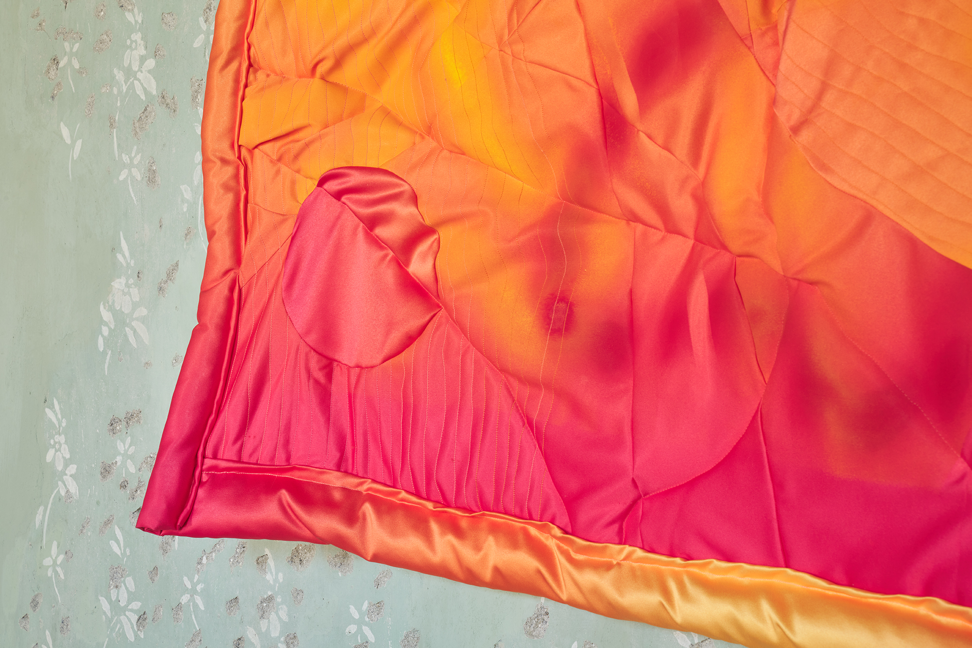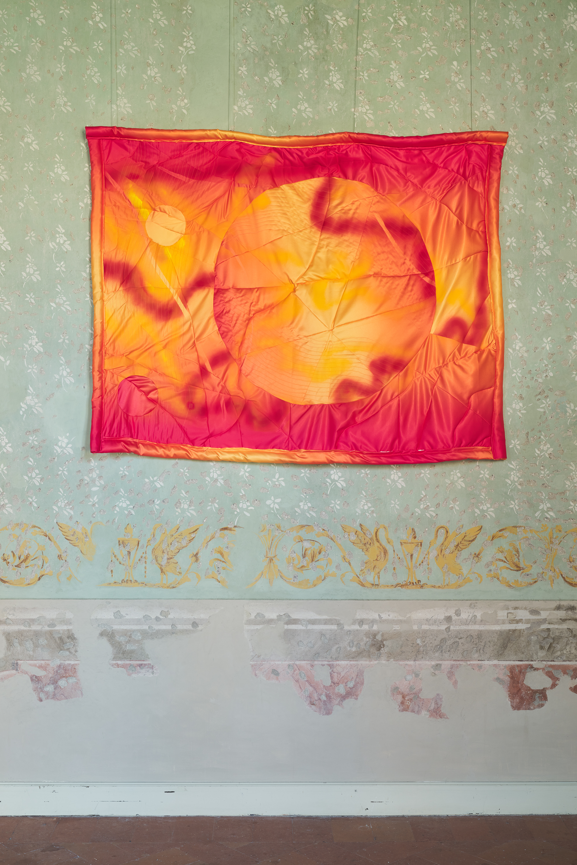 2021, acrylic spray on printed fabric, stitched and padded with wadding and canvas, 138 x 180 cm
